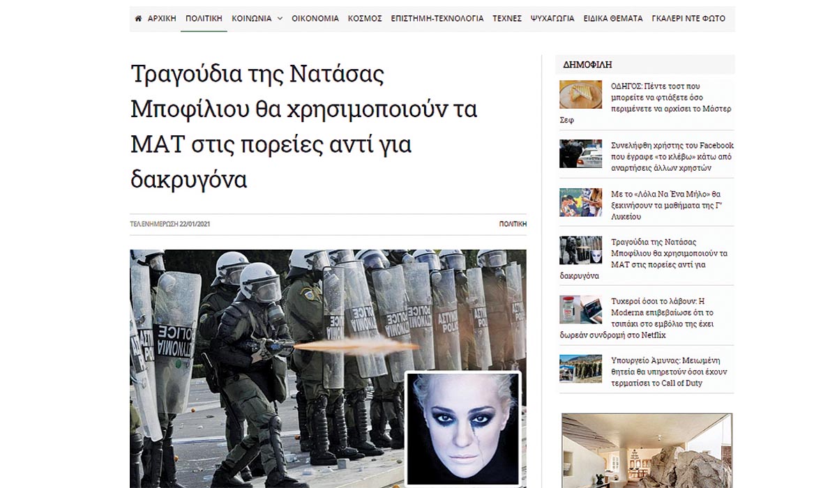 ➥ Το άρθρο, μεταξύ άλλων, ανέφερε τα εξής: «Την πρόθεσή του να προχωρήσει στη σταδιακή μείωση της χρήσης δακρυγόνων και την αντικατάστασή τους με τραγούδια της Νατάσας Μποφίλιου ανακοίνωσε το υπουργείο Προστασίας του Πολίτη, στο πλαίσιο του νέου σχεδίου για την αντιμετώπιση των διαδηλώσεων.