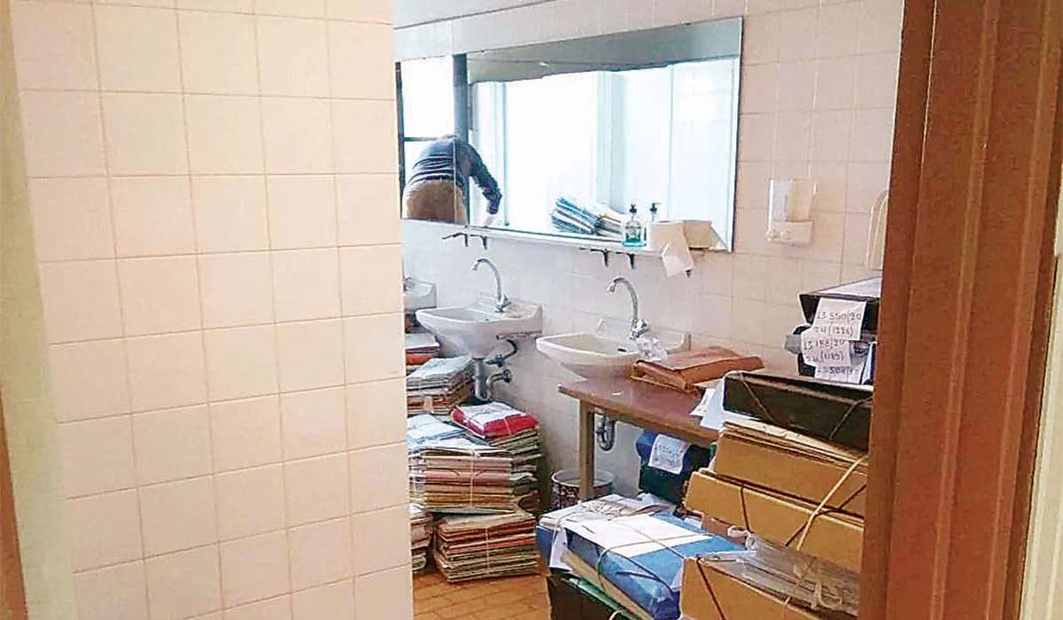 ➤ Η φωτογραφία με τις στοίβες φακέλων και ντοσιέ έχει ληφθεί στο Πρωτοδικείο Αθηνών. Το newsbreak.gr, που δημοσίευσε πρώτο αυτή την αποκαρδιωτική λήψη, έγραφε: «Μπορεί οι δικογραφίες τακτικής διαδικασίας να φτάνουν μέχρι τις τουαλέτες, γεγονός που φυσικά αποτελεί ντροπή για το ελληνικό κράτος, φαίνεται όμως ότι κάποιοι έχουν τη δυνατότητα να εξυπηρετούνται με διαδικασίες-εξπρές.