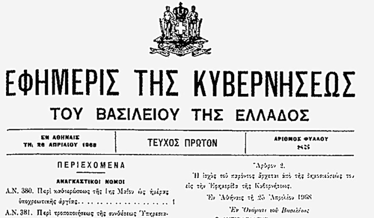 ➤ Ο αναγκαστικός νόμος υπ’ αριθ. 380/1968, που δημοσιεύτηκε στο ΦΕΚ 85/Α/26-4-1968 (βλ. Εικόνα), τιτλοφορείται «Περί καθιερώσεως της 1ης Μαΐου ως ημέρας υποχρεωτικής αργίας» και αναφέρει στο άρθρο 1: «Δύναται δι’ αποφάσεως του υπουργού Εργασίας, κατ’ έτος εκδιδομένης, να καθορίζηται ως ημέρα υποχρεωτικής αργίας η 1η Μαΐου».