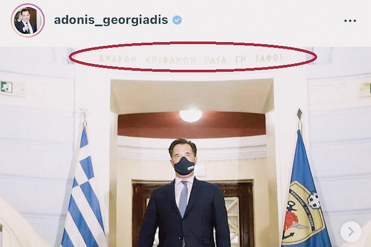 ➤ Πολλά παρατήρησε ο συντάκτης του newsbreak.gr, αλλά του ξέφυγε ένα δυσάρεστο, το οποίο μάλλον δεν θέλησε να συνειδητοποιήσει (ένεκα της ανυποκρίτου λατρείας που τρέφει στο πρόσωπο του Αδωνη): Tην ιστορική μεν (Θουκυδίδου «Επιτάφιος» Β, 43), αλλά δυσοίωνη επιγραφή πάνω από το υπουργικό κεφάλι: «Ανδρών επιφανών πάσα γη τάφος».