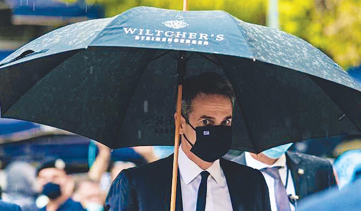 ➤ Ο νυν πρωθυπουργός τις προάλλες κυκλοφόρησε με ομπρέλα πεντάστερου ξενοδοχείου (εικόνα νο 1).