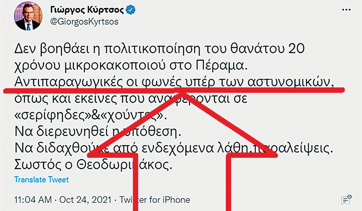 ➤ Ο Κύρτσος δεν χόρτασε με την πρώτη ανάρτηση για το περιστατικό με τον Ρομά και επανήλθε: «Δεν βοηθάει η πολιτικοποίηση του θανάτου 20χρόνου μικροκακοποιού στο Πέραμα. Αντιπαραγωγικές οι φωνές υπέρ των αστυνομικών, όπως και εκείνες που αναφέρονται σε “σερίφηδες” και “χούντες”. Να διερευνηθεί η υπόθεση. Να διδαχθούμε από ενδεχόμενα λάθη, παραλείψεις. Σωστός ο Θεοδωρικάκος».