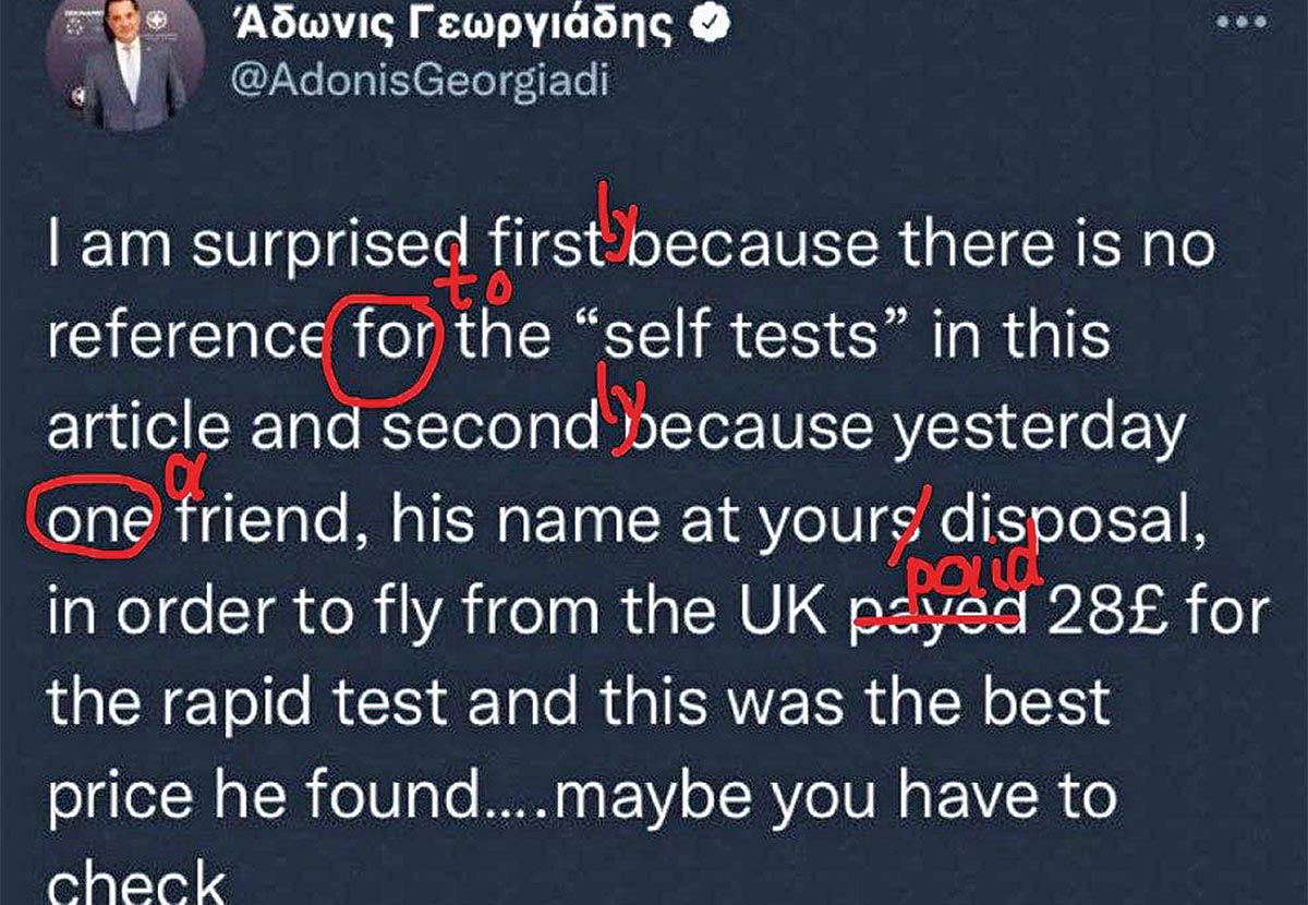 ➤ Δείτε στην εικόνα, που κυκλοφορεί ευρέως στο διαδίκτυο, ανάρτηση του Αδώνιδος σε (περίπου) αγγλικά. Με το κόκκινο είναι οι διορθώσεις. «Αριστα 3», όπως θα έλεγε ο Ιάσονας Τριανταφυλλίδης.