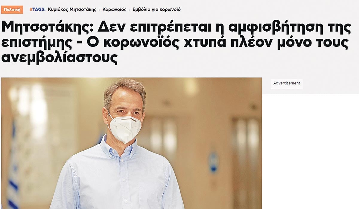 ➤ Αυτή η υποψία ή/και πεποίθηση ότι ο πρωθυπουργός παραμένει ανεμβολίαστος θα οφειλόταν σε δήλωση που έκανε ο ίδιος τον Ιούλιο του 2021, όταν έλεγε: «Δεν επιτρέπεται η αμφισβήτηση της επιστήμης! […] Οταν οι ειδικοί προειδοποιούν πως ο κορονοϊός χτυπά, πλέον, μόνον τους ανεμβολίαστους, δεν υπάρχει χώρος για διπρόσωπες τοποθετήσεις».