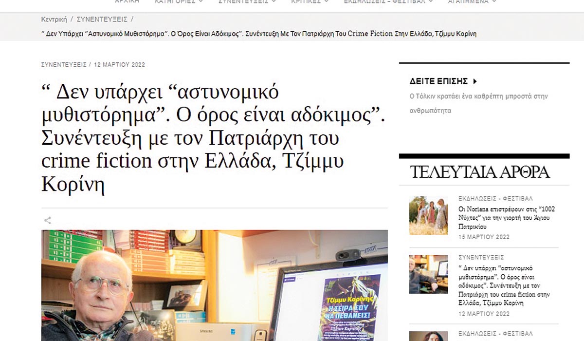 ➤ Στο «Αβαλον Των Τεχνών» δημοσιεύτηκε μια ιδιαίτερα ενδιαφέρουσα συνέντευξη. Την παραχώρησε ο «πατριάρχης του crime fiction στην Ελλάδα» Τζίμμυς Κορίνης στον συγγραφέα Γιώργο Σταφυλά.
