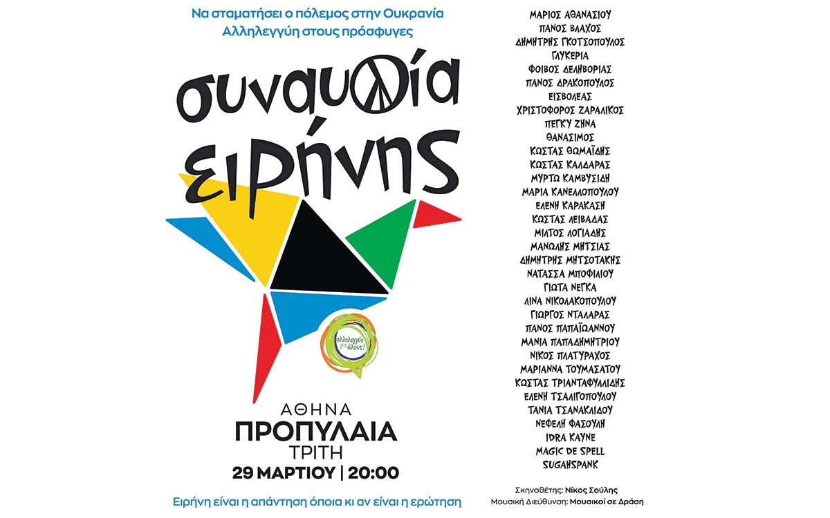 ➤Κάποιοι καλλιτέχνες, προσκείμενοι κυρίως στην Αριστερά, αποφάσισαν να κάνουν συναυλία υπέρ της ειρήνης, χωρίς να της δώσουν τέζα-ούλτρα αντιρωσικό χαρακτήρα.