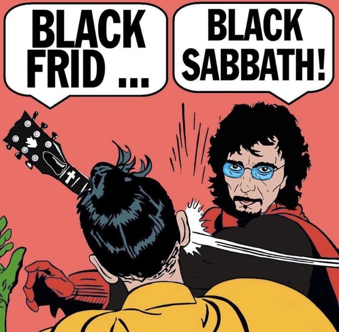 ● Σε άλλο εικαστικό βλέπουμε τον Tony Iommi, κιθαρίστα των Black Sabbath, σε ρόλο… Μπάτμαν, να χαστουκίζει τον βοηθό του που λέει «Black Friday» και να τον διορθώνει λέγοντας «Black Sabbath».