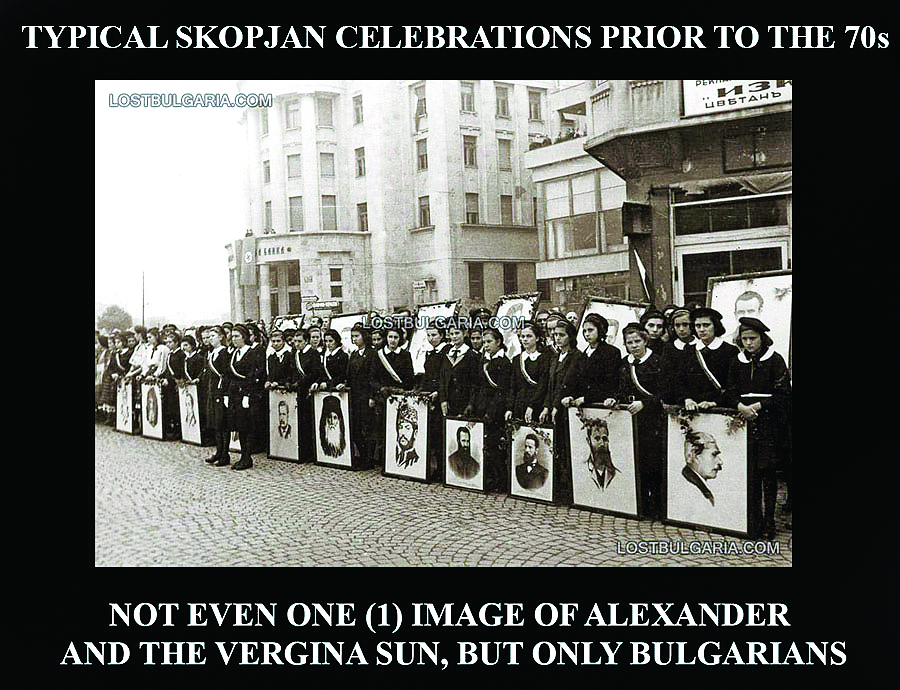 Φωτό 2: «Τυπικοί σκοπιανοί εορτασμοί πριν τη δεκαετία του ’70. Ούτε μία εικόνα του Αλεξάνδρου και του άστρου της Βεργίνας, αλλά μόνο Βουλγάρων»