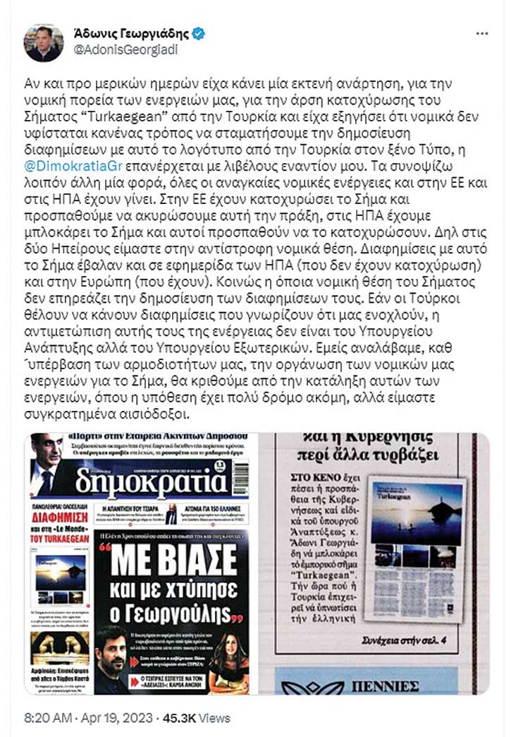 ● Ο Αδωνις Γεωργιάδης θα μείνει στην ιστορία της σύγχρονης πολιτικής ζωής για κάτι ιδιαίτερα σημαντικό: είναι ο υπουργός Ανάπτυξης επί των ημερών του οποίου κατοχυρώθηκε στην Ε.Ε. το εμπορικό σήμα «Turkaegean» για λογαριασμό της Τουρκίας – κάτι για το οποίο οφείλει να δώσει εξηγήσεις όχι στο twitter, στο facebook και στους τηλεοπτικούς σταθμούς όπου εμφανίζεται, αλλά αρμοδίως, όταν υπάρξουν οι κατάλληλες περιστάσεις.
