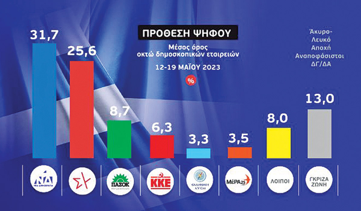 ● ΕΝΔΕΙΚΤΙΚΑ αναφέρεται ότι στο αποκληθέν «γκάλοπ των γκάλοπ», δηλαδή τη μέση πρόθεση ψήφου -μέσος όρος από τα δεδομένα οκτώ εταιριών δημοσκοπήσεων-, που μετέδωσε το βράδυ της Παρασκευής 19 Μαΐου η ΕΡΤ, στην πρόθεση ψήφου η Ν.Δ. προηγείτο με 31,7% και ακολουθούσε ο ΣΥΡΙΖΑ με 25,6%. Αυτό κάνει μια διαφορά 6,1%.