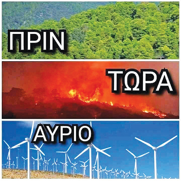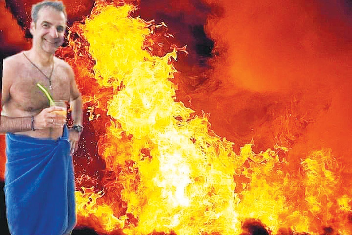 ● Στο δεύτερο συνδυάζεται η ανάλαφρη, θερινή περιβολή του κ. Μητσοτάκη με τις φλόγες της Αποκαλύψεως, που καταπίνουν τα δάση μας.