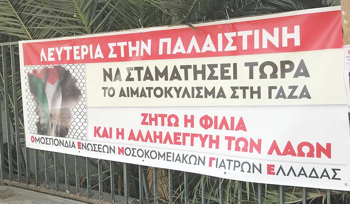 - Το πανό γράφει «Λευτεριά στην Παλαιστίνη. Να σταματήσει τώρα το αιματοκύλισμα στη Γάζα».