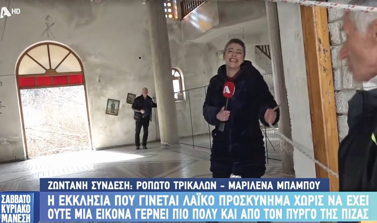 ● Και, σαν να μην έφτανε αυτό, ο Μάνεσης επιτρέπει στη δημοσιογράφο (η οποία είπε σε έναν ηλικιωμένο το ελληνέζικο ότι είναι… «ογδοντατέσσερα (sic) ετών») να χασκογελάει βλακωδώς εντός του ιερού ναού κι έκανε κι αυτός πλακίτσα, διατάζοντάς την να πάει προς το κατωφερές τμήμα του.