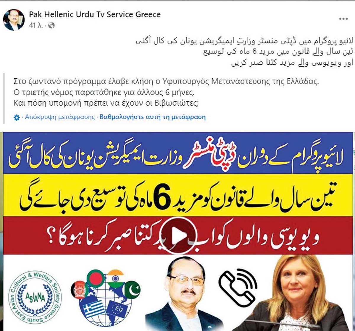 ● «Οπως φαίνεται στο βίντεο, η αρμόδια υφυπουργός Μετανάστευσης Σοφία Βούλτεψη τηλεφωνεί σε γνωστό Πακιστανό μεγαλοπαράγοντα για να τον ενημερώσει ότι η διαδικασία νομιμοποίησης παράνομων μεταναστών θα επεκταθεί για 6 μήνες.