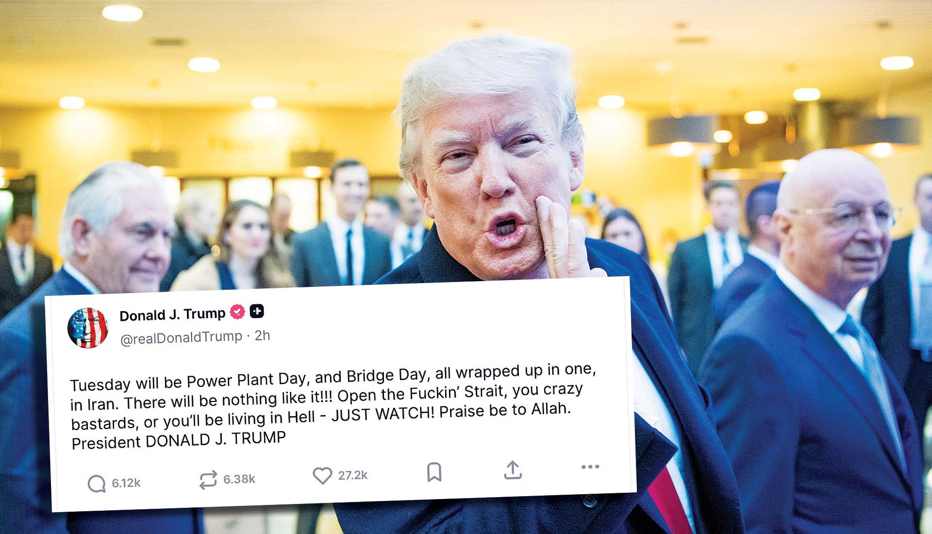 ● «Την Τρίτη θα είναι η “Ημέρα Εργοστασίων Ηλεκτρικής Ενέργειας” και η “Ημέρα Γεφυρών”, όλα μαζί σε ένα, στο Ιράν. Δεν θα υπάρχει τίποτα παρόμοιο! Ανοίξτε τα γαμημ$ν@ Στενά, τρελαμένοι μπάσταρδοι, αλλιώς θα ζείτε στην Κόλαση. ΑΠΛΩΣ ΘΑ ΔΕΙΤΕ! Δόξα στον Αλλάχ. Πρόεδρος ΝΤΟΝΑΛΝΤ ΤΖ. ΤΡΑΜΠ».