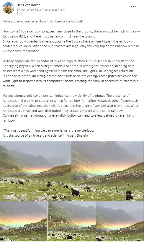 «Έχεις δει ποτέ ουράνιο τόξο τόσο κοντά στο έδαφος; Πώς συμβαίνει αυτό; Για να εμφανιστεί ένα ουράνιο τόξο χαμηλά, ο ήλιος πρέπει να βρίσκεται ψηλά στον ουρανό (αλλά κάτω από τις 42°) και να υπάρχει βροχή ή ομίχλη κοντά στο έδαφος. Επειδή το κέντρο του ουράνιου τόξου βρίσκεται πάντα απέναντι από τον ήλιο, όσο ο ήλιος ανεβαίνει πιο ψηλά, τόσο χαμηλότερα κατεβαίνει και το κέντρο του τόξου. Όταν ο ήλιος φτάσει περίπου στις 42°, μόνο η κορυφή του ουράνιου τόξου είναι ορατή πάνω από τον ορίζοντα. Για να εκτιμήσουμε πραγματικά την ομορφιά ενός χαμηλού ή ενός ψηλού ουράνιου τόξου, χρειάζεται να κατανοήσουμε τη φυσική που κρύβεται πίσω από το φαινόμενο. Όταν το ηλιακό φως εισέρχεται σε μια σταγόνα βροχής, διαθλάται — δηλαδή λυγίζει καθώς περνά από τον αέρα στο νερό και ξανά καθώς εξέρχεται από τη σταγόνα. Μέσα στη σταγόνα, το φως αντανακλάται στην εσωτερική της επιφάνεια πριν εξέλθει. Αυτές οι διεργασίες κάνουν το λευκό φως να διασπάται στα επιμέρους χρώματά του, σχηματίζοντας το γνωστό φάσμα του ουράνιου τόξου. Διάφορες ατμοσφαιρικές συνθήκες επηρεάζουν το πόσο καθαρά φαίνεται ένα ουράνιο τόξο. Η παρουσία σταγόνων νερού στον αέρα είναι, φυσικά, απαραίτητη, αλλά σημαντικό ρόλο παίζουν επίσης το μέγεθός τους, η κατανομή τους και η γωνία του ηλιακού φωτός. Όταν οι σταγόνες είναι μικρές και ομοιόμορφα κατανεμημένες, δημιουργούν ένα ζωηρό και καθαρό ουράνιο τόξο. Αντίθετα, οι μεγαλύτερες ή άνισα κατανεμημένες σταγόνες μπορούν να κάνουν το τόξο πιο θαμπό ή αχνό. Το ωραιότερο πράγμα που μπορούμε να βιώσουμε είναι το μυστηριώδες. Είναι η πηγή κάθε αληθινής τέχνης και επιστήμης -Άλμπερτ Αϊνστάιν», έγραψε ο Ολλανδός.