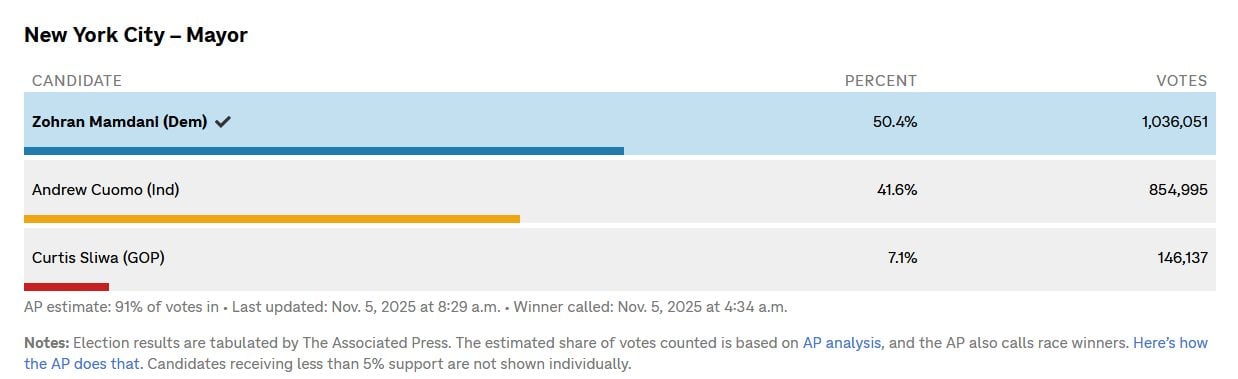 Η αναμέτρηση κρίθηκε γρήγορα το βράδυ της Τρίτης, με τον Μαμντάνι να εξασφαλίζει σαφή διαφορά από τους αντιπάλους του και να γίνεται ο νέος δήμαρχος της Νέας Υόρκης.
