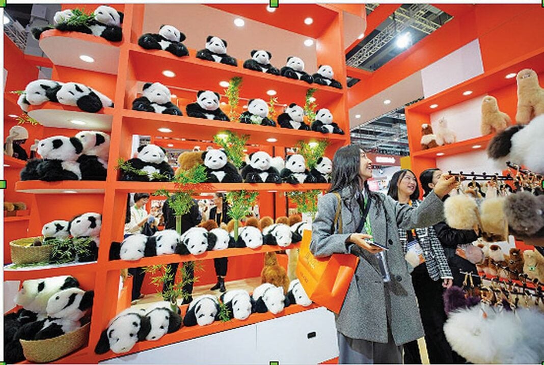 1) Επισκέπτες αγοράζουν λούτρινα παιχνίδια στην Περιοχή Εκθεσης Καταναλωτικών Αγαθών της 7ης Διεθνούς Εκθεσης Εισαγωγών της Κίνας (CIIE), στη Σανγκάη, στις 6 Νοεμβρίου του 2024 (Φωτογραφία/Tang Ke)