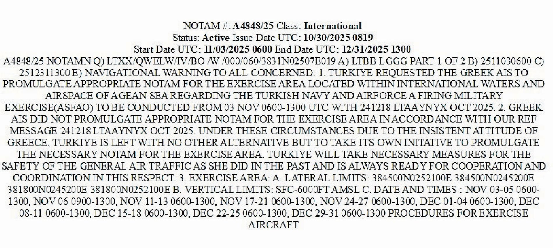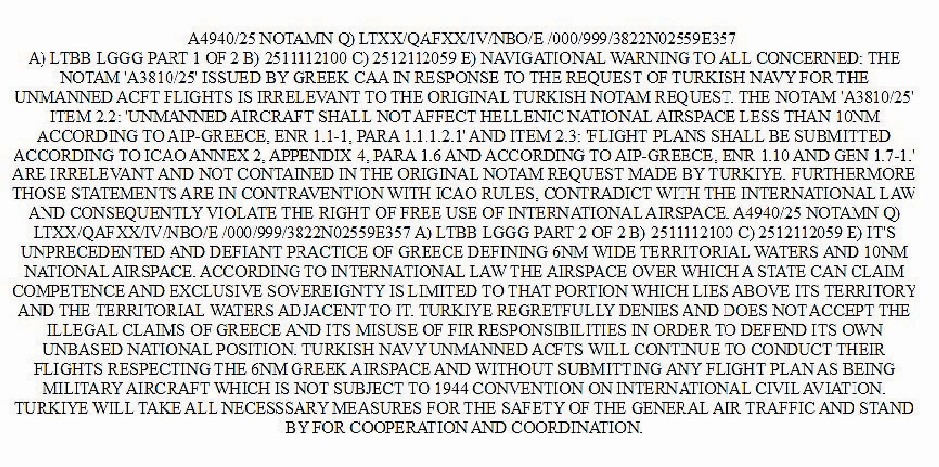 Ομως, η Τουρκία στις 4 Νοέμβριου 2025 δήλωσε διεθνώς ότι δέχεται μόνο τα 6 ν.μ. χωρικά ύδατα και εναέριου χώρου στο Αιγαίο και ότι κανένα τουρκικό αεροπορικό μέσο δεν θα καταθέτει σχέδια πτήσης.