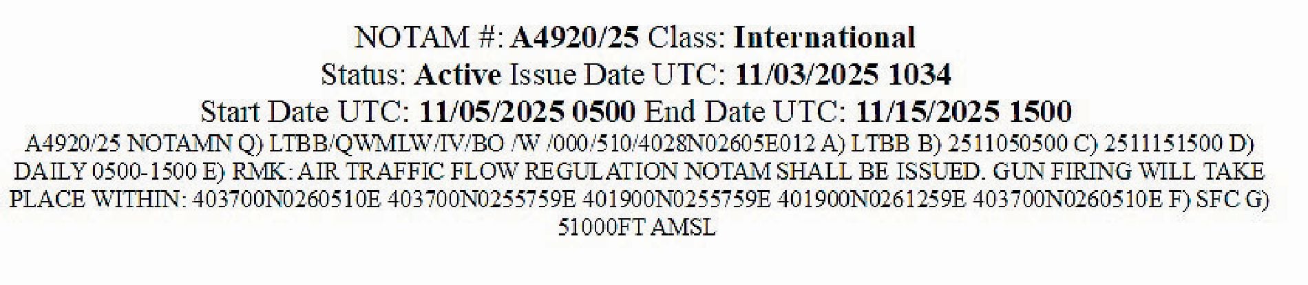 Ωστόσο, η Τουρκία με νεότερη διεθνή αγγελία 4848/25 δήλωσε διεθνώς ότι θα εκτελέσει άσκηση από τις 3 Νοεμβρίου έως τις 31 Δεκεμβρίου 2025 και στις 25 Δεκεμβρίου, δηλαδή αναίρεσε διεθνώς τον εαυτό της. Ετσι, η κυβέρνηση συνεχίζει να έχει κλειστά τα πεδία βολής για τις 10 Νοεμβρίου, τιμώντας ενεργά τον Ατατούρκ, αφήνοντας στο έλεος του Αλλάχ τη θρησκευτική εορτή των Χριστουγέννων.