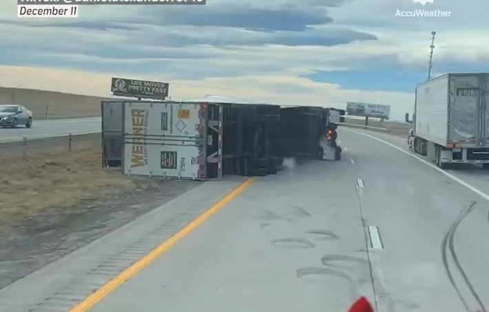 Caught on camera: Watch as a semi flips over from strong winds along I-25 in Wyoming. pic.twitter.com/J6LpeKeda5