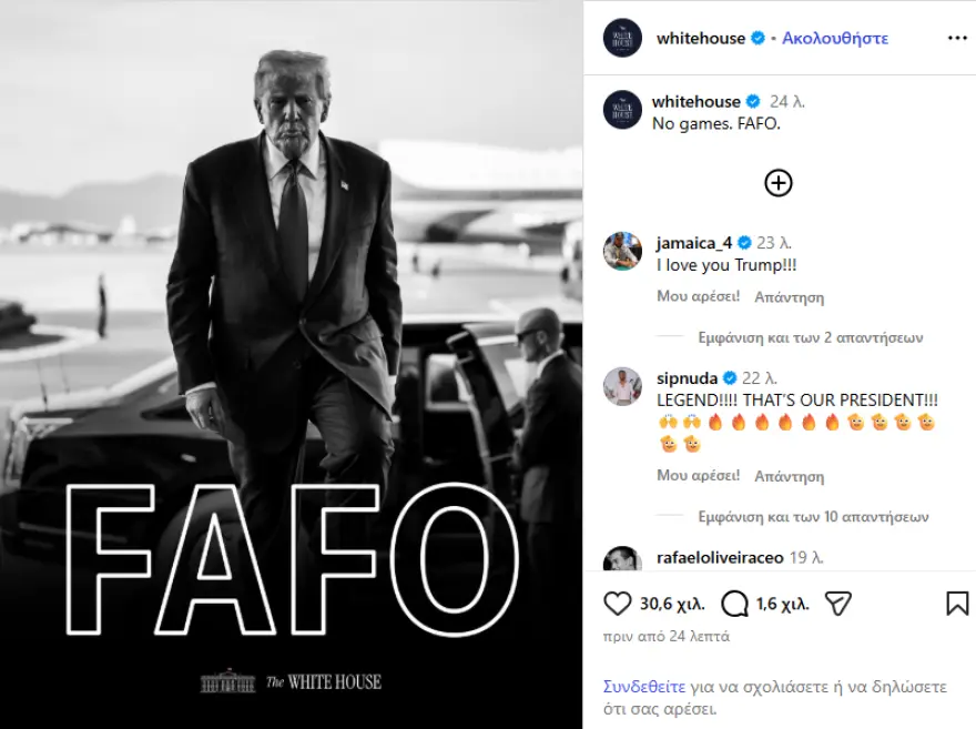 Ανάρτηση στο Instagram μετά τη σύλληψη του Νικολάς Μαδούρο έκανε ο Λευκός Οίκος με μία ασπρόμαυρη φωτογραφία που δείχνει τον Ντόναλντ Τραμπ και το «FAFO» που είναι ένα ακρωνύμιο της αργκό για το «Fuck Around and Find Out».