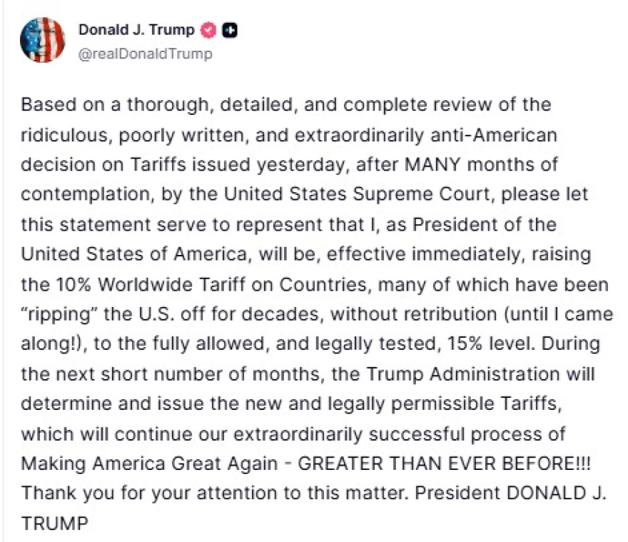 «Με βάση μια διεξοδική, λεπτομερή και πλήρη ανασκόπηση της γελοίας, κακογραμμένης και εξαιρετικά αντιαμερικανικής απόφασης σχετικά με τους δασμούς που εκδόθηκε χθες, μετά από ΠΟΛΛΟΥΣ μήνες σκέψης, από το Ανώτατο Δικαστήριο των Ηνωμένων Πολιτειών, παρακαλώ να θεωρηθεί η παρούσα δήλωση ως δήλωση ότι εγώ, ως Πρόεδρος των Ηνωμένων Πολιτειών της Αμερικής, θα αυξήσω, με άμεση ισχύ, τον παγκόσμιο δασμό 10% σε χώρες, πολλές από τις οποίες «εκμεταλλεύονταν» τις Ηνωμένες Πολιτείες για δεκαετίες, χωρίς αντίποινα (μέχρι που ήρθα εγώ!), στο πλήρως επιτρεπόμενο και νομικά ελεγμένο επίπεδο του 15%. Κατά τη διάρκεια των επόμενων λίγων μηνών, η κυβέρνηση Τραμπ θα καθορίσει και θα εκδώσει τους νέους και νομικά επιτρεπόμενους δασμούς, οι οποίοι θα συνεχίσουν την εξαιρετικά επιτυχημένη διαδικασία μας για να κάνουμε την Αμερική ξανά μεγάλη – ΜΕΓΑΛΥΤΕΡΗ ΑΠΟ ΠΟΤΕ!!! Σας ευχαριστώ για την προσοχή σας σε αυτό το θέμα. Πρόεδρος ΝΤΟΝΑΛΝΤ ΤΡΑΜΠ»