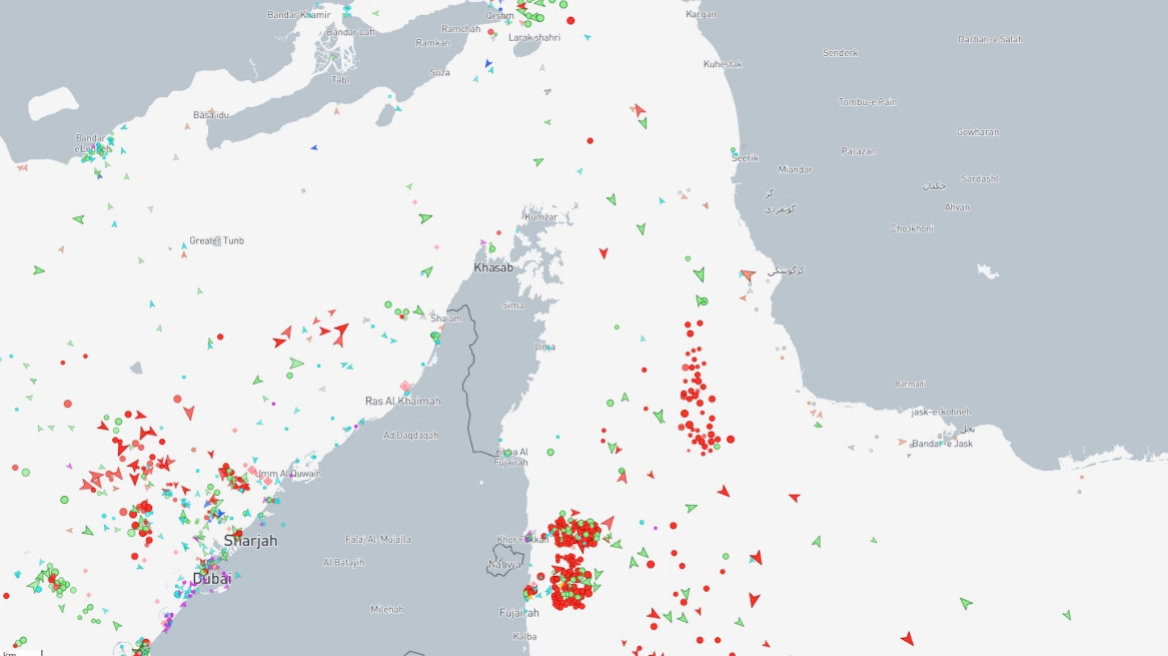 Στον χάρτη του Marine Traffic καταγράφεται μειωμένη κίνηση πλοίων στο σημείο των Στενών του Ορμούζ, με έντονη συγκέντρωση πλοίων και στις δύο πλευρές του Στενού, γεγονός που υπογραμμίζει τη σοβαρότητα της κατάστασης.