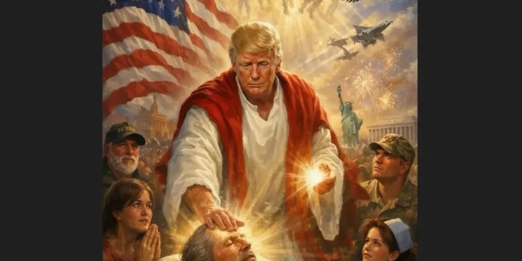 Στη συγκεκριμένη εικόνα, ο Τραμπ εμφανίζεται ντυμένος με λευκή και κόκκινη τήβεννο, σε σκηνή αναπαράστασης θεραπείας ασθενούς. Η σύνθεση τον δείχνει να ακουμπά το μέτωπο ενός νοσηλευόμενου, ενώ ένα έντονο λευκό φως εκπορεύεται από το χέρι του. Το θρησκευτικό αυτό σκηνικό πλαισιώνεται από μια σειρά εθνικών και στρατιωτικών συμβόλων των ΗΠΑ, όπως η αμερικανική σημαία, το Άγαλμα της Ελευθερίας, αετοί και μαχητικά αεροσκάφη, δημιουργώντας μια πρωτοφανή μείξη θρησκευτικού μεσσιανισμού και αμερικανικού πατριωτισμού.