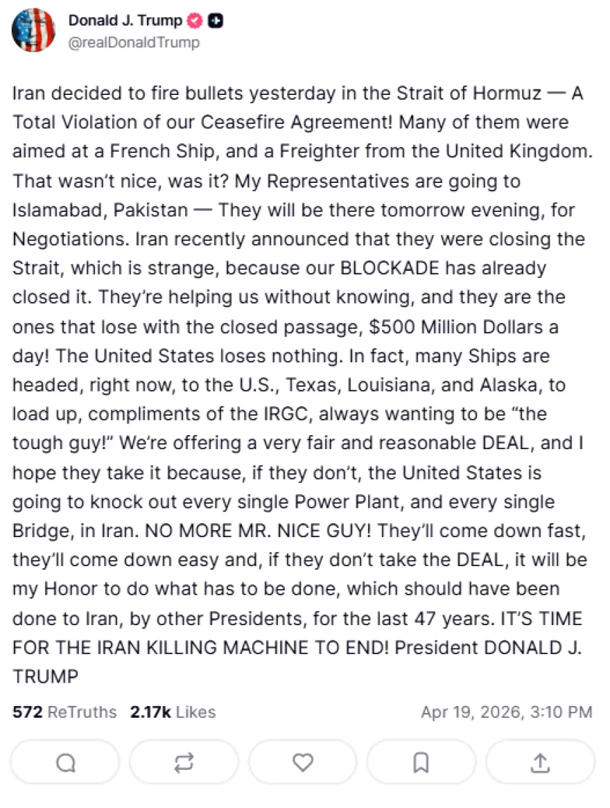 «Το Ιράν αποφάσισε χθες να ρίξει πυροβολισμούς στο Στενό του Ορμούζ — Μια πλήρης παραβίαση της συμφωνίας κατάπαυσης του πυρός που έχουμε συνάψει! Πολλοί από αυτούς στόχευαν ένα γαλλικό πλοίο και ένα φορτηγό πλοίο από το Ηνωμένο Βασίλειο. Δεν ήταν και πολύ ωραίο αυτό, έτσι; Οι εκπρόσωποί μου πηγαίνουν στο Ισλαμαμπάντ του Πακιστάν — θα βρίσκονται εκεί αύριο το βράδυ, για διαπραγματεύσεις. Το Ιράν ανακοίνωσε πρόσφατα ότι θα κλείσει το Στενό, κάτι που είναι παράξενο, επειδή ο ΑΠΟΚΛΕΙΣΜΟΣ μας το έχει ήδη κλείσει.