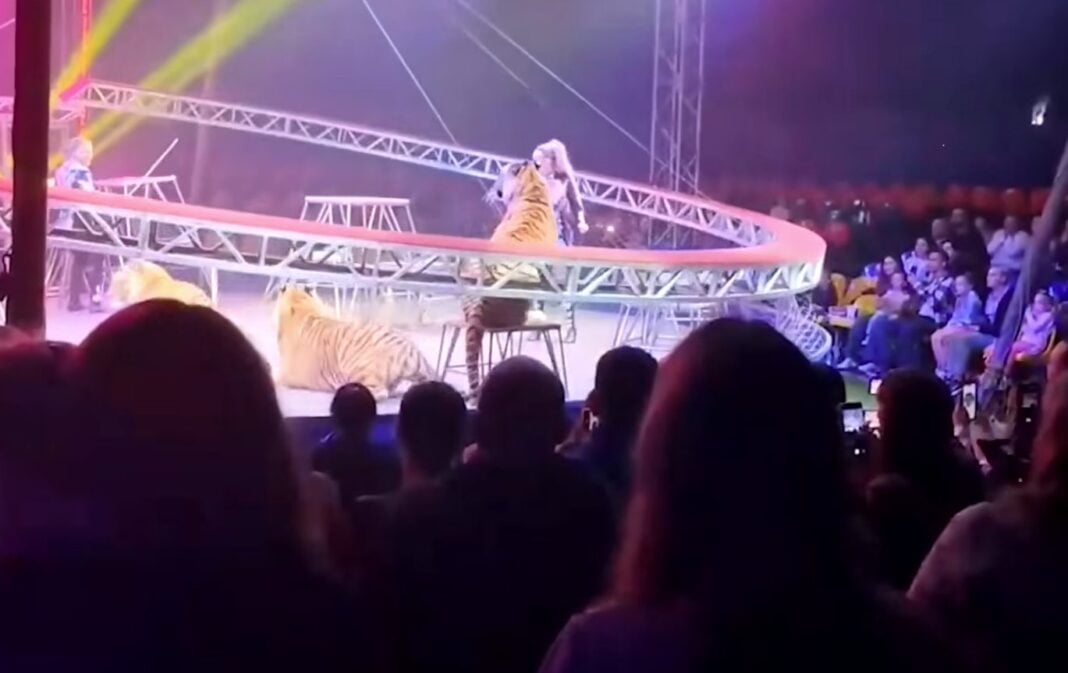 Στιγμές απόλυτου τρόμου έζησαν οι θεατές σε τσίρκο της πόλης Ροστόφ επί του Ντον, στη νότια Ρωσία, όταν μια τίγρης κατάφερε να διαπεράσει τα μέτρα ασφαλείας και να πηδήξει προς το μέρος του κοινού. Το περιστατικό σημειώθηκε στις 19 Απριλίου, κατά τη διάρκεια νούμερου με τρεις τίγρεις και δύο εκπαιδευτές, την ώρα που το προστατευτικό δίχτυ πάνω από την αρένα κατέρρευσε ξαφνικά, προκαλώντας αναταραχή στα ζώα.