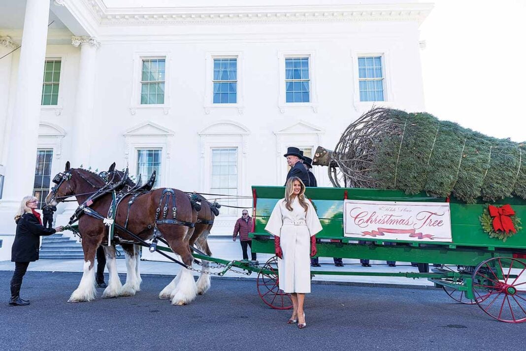 Με κάθε επισημότητα, όπως επιτάσσει η αμερικανική χριστουγεννιάτικη παράδοση, η πρώτη κυρία των ΗΠΑ Μελάνια Τραμπ υποδέχτηκε έξω από τον Λευκό Οίκο στην Ουάσινγκτον το χριστουγεννιάτικο δέντρο του 2025.