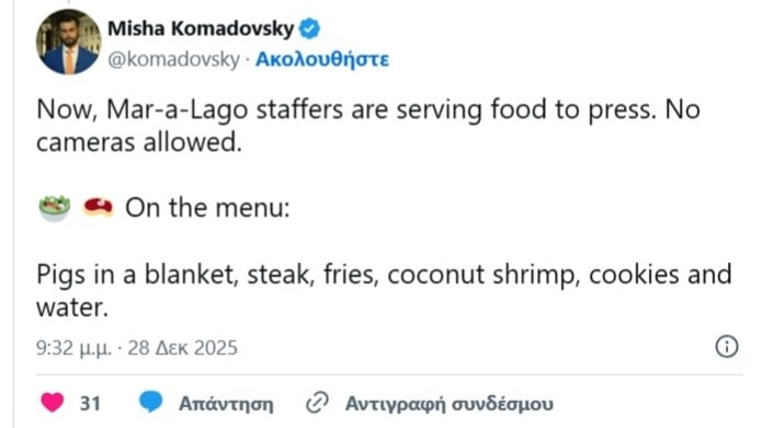 «Τώρα, το προσωπικό του Mar-a-Lago σερβίρει φαγητό σε δημοσιογράφους. Δεν επιτρέπονται κάμερες. Στο μενού: λουκανικοπιτάκια, μπριζόλα, πατάτες τηγανητές, γαρίδες καρύδας, cookies και νερό».