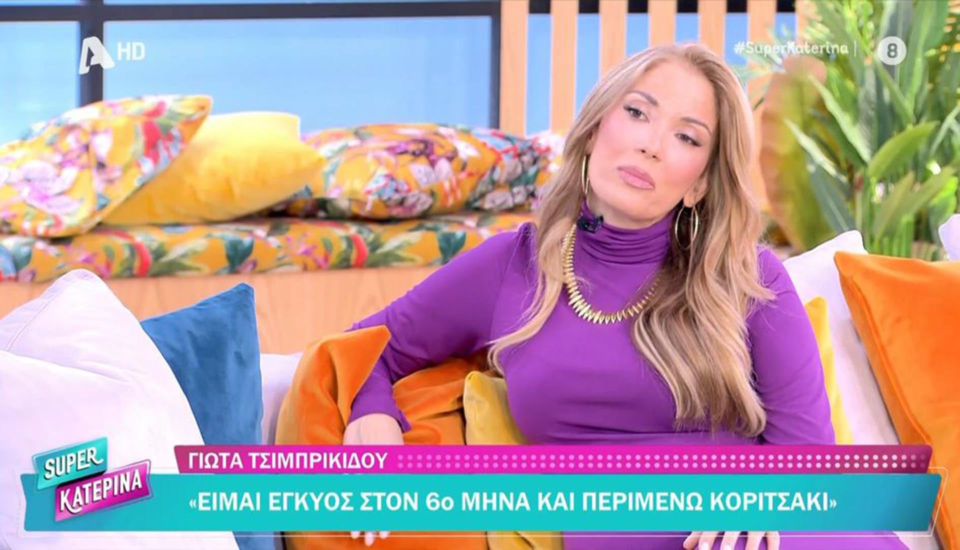 Στην αρχή της συνέντευξης η Γιώτα Τσιμπρικίδου αναφέρθηκε στις προσπάθειες που έκανε με τον σύζυγό της, μέχρι να καταφέρει να μείνει έγκυος: «Εγώ έχω προσπαθήσει πολύ. Εμείς είμαστε από τις περιπτώσεις των ανθρώπων που δεν είχαμε κάποιο πρόβλημα. Είναι okay να έχεις, να μην έχεις, όλα αντιμετωπίζονται. Δεν είχαμε κανένα πρόβλημα. Παρ’ όλα αυτά, περνούσανε τα χρόνια και δεν ερχότανε το παιδάκι. Είναι και η ηλικία, γιατί διαφορετικά είναι να είσαι 25-30 και διαφορετικά να είσαι 40 κάτι. Εμπιστεύτηκα τους γιατρούς μου. Θέλω πολύ να το πω αυτό. Εγώ δύο πράγματα με κράτησαν σε αυτό και έχω φτάσει μέχρι εδώ και μακάρι να πάνε όλα καλά».