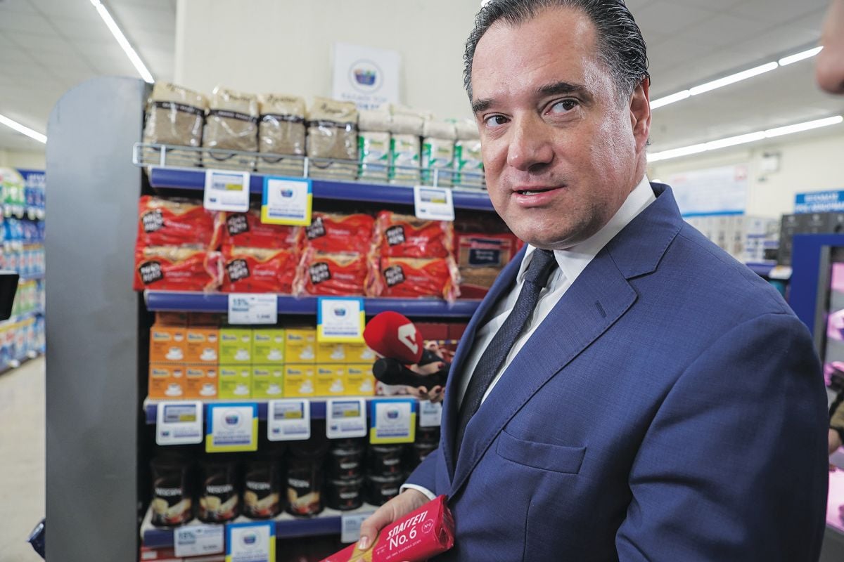 Ακόμα και ο Αδωνις Γεωργιάδης (κεντρική φωτό) παραδέχεται πλέον τις ανατιμήσεις στα ράφια των σούπερ μάρκετ.