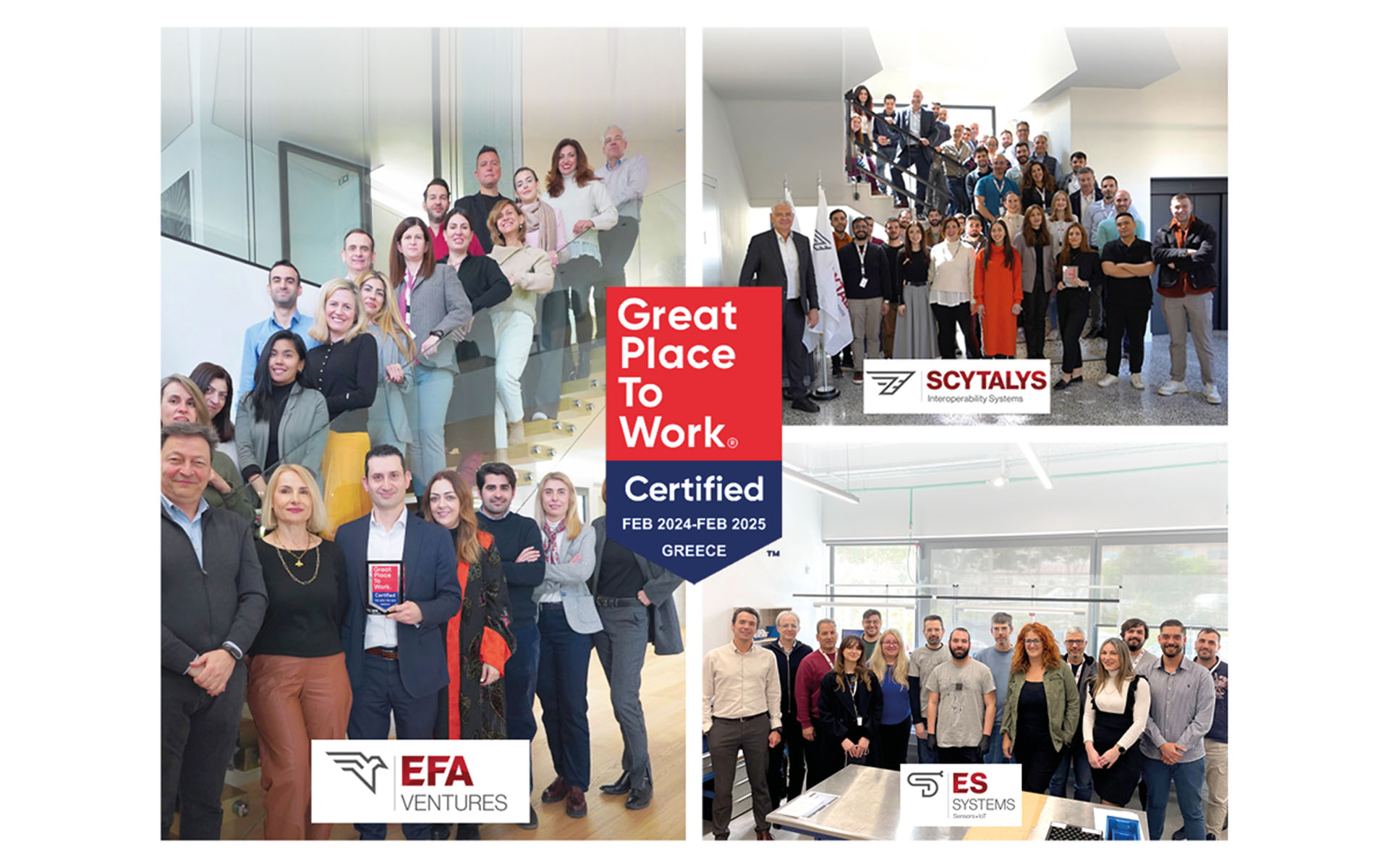 Οι εταιρίες του EFA GROUP, EFA VENTURES, SCYTALYS και ES SYSTEMS, που δραστηριοποιούνται στον τομέα της Αεροδιαστημικής, Ασφάλειας, Άμυνας και Βιομηχανικών Συνεργασιών, ανακοινώνουν ότι απέκτησαν, για 2η συνεχόμενη χρονιά, την Πιστοποίηση Great Place to Work®, μετά από αξιολόγηση που διενήργησε ο οργανισμός Great Place to Work® Hellas.