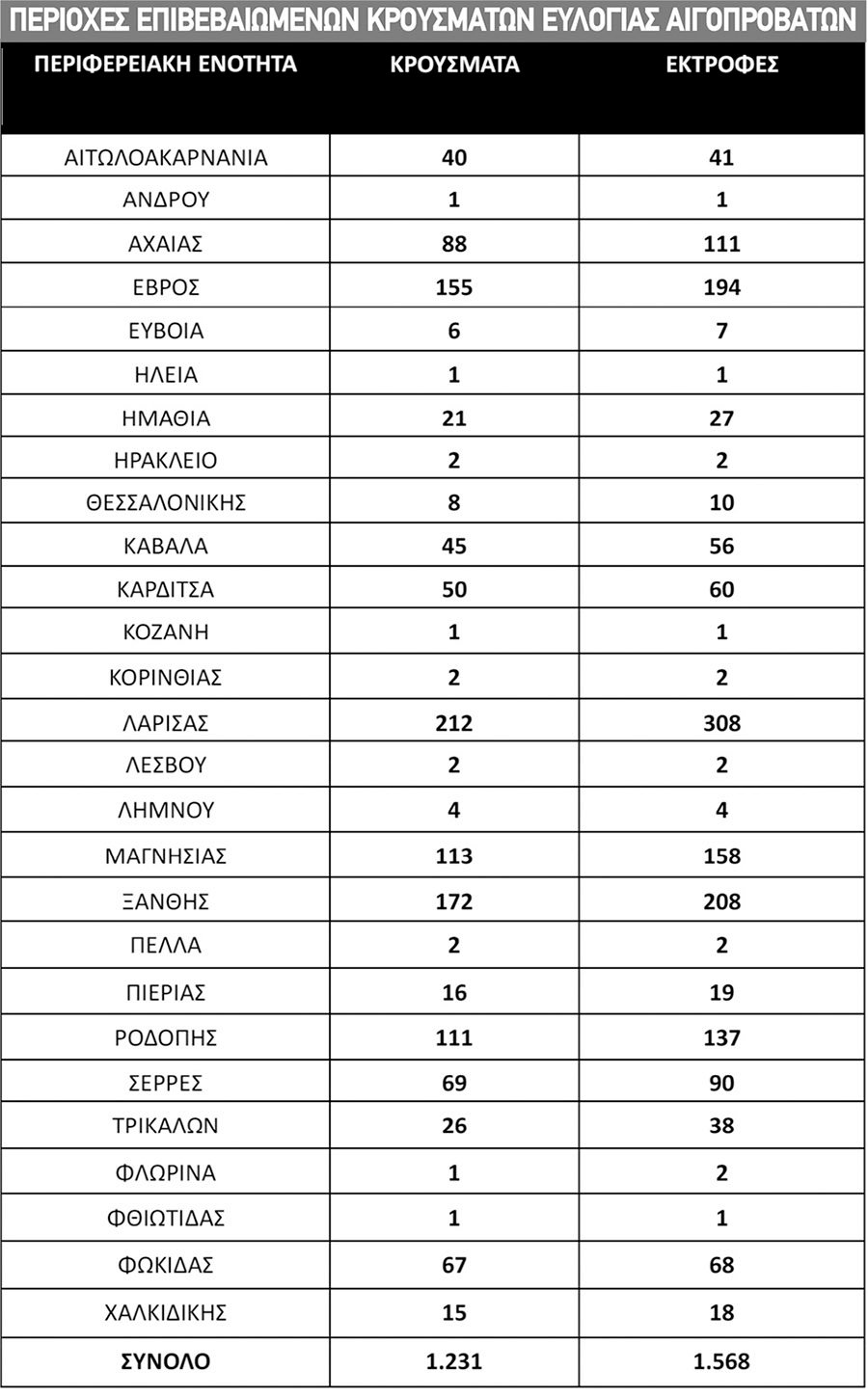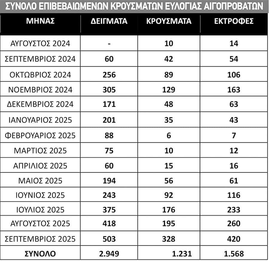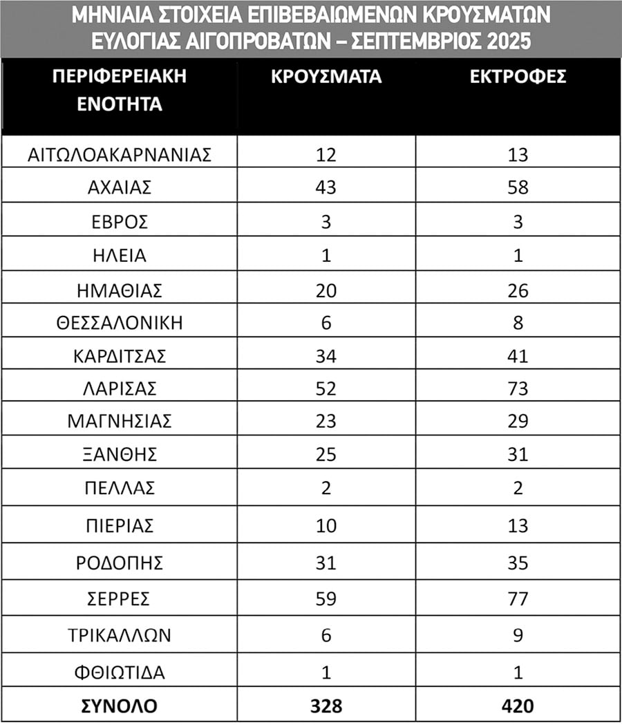 Μόνο τον Σεπτέμβριο οι θανατώσεις εκτοξεύτηκαν στις 65.014 από 55.151 τον Αύγουστο και 58.441 τον Ιούλιο, ενώ τα κρούσματα έφτασαν τον Σεπτέμβριο τα 328 σε συνολικά 420 κτηνοτροφικές εκτροφές. Τα περισσότερα απ’ αυτά καταγράφονται στις Σέρρες (59) και στη Λάρισα (52), ενώ ακολουθούν η Αχαΐα (43), η Καρδίτσα (34) και η Ροδόπη (31).