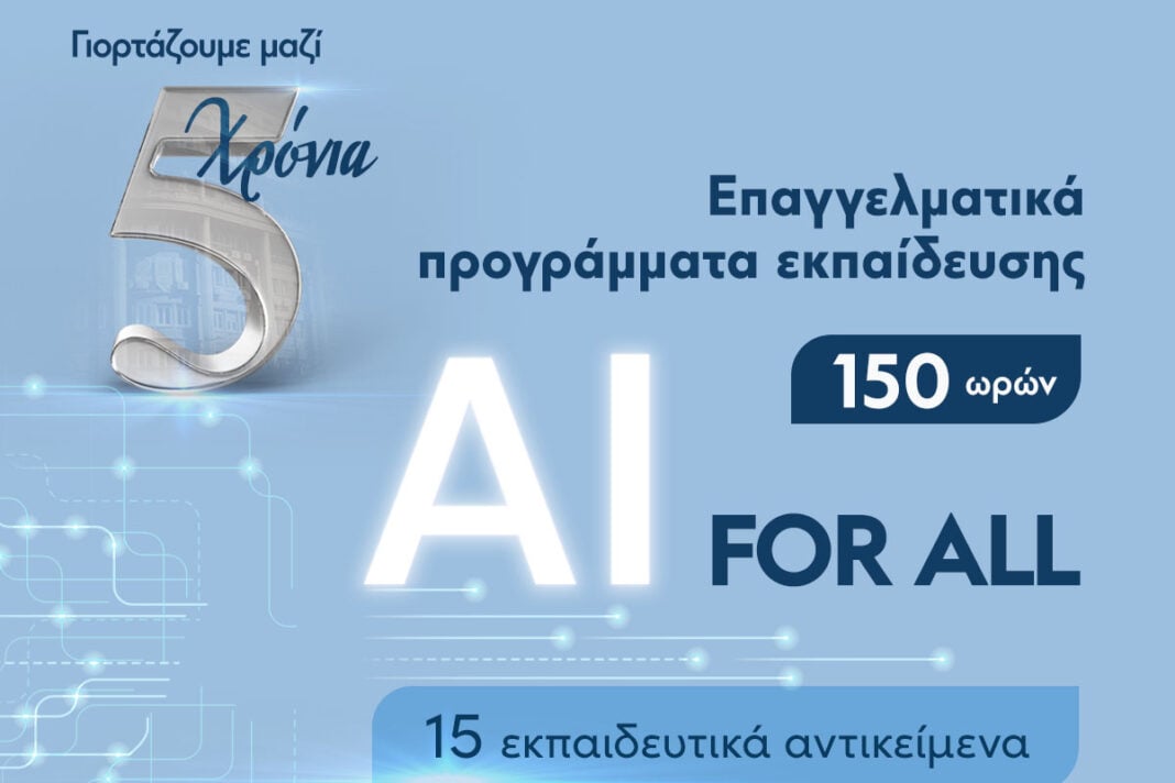 Ο Ομιλος D Group, ένας από τους πλέον δραστήριους στον χώρο της επαγγελματικής κατάρτισης και πιστοποίησης, γιορτάζει φέτος πέντε χρόνια δυναμικής παρουσίας και πρωτοπορεί για ακόμη μία φορά, παρουσιάζοντας το νέο μεγάλο εκπαιδευτικό εγχείρημα «AI FOR ALL». Απευθύνεται σε εργαζομένους, ανέργους και εκπαιδευτικούς. Η υλοποίησή του αρχίζει στις 11 Δεκεμβρίου, ενώ η πλατφόρμα για την εκδήλωση ενδιαφέροντος θα ανοίξει στις 7 Νοεμβρίου.