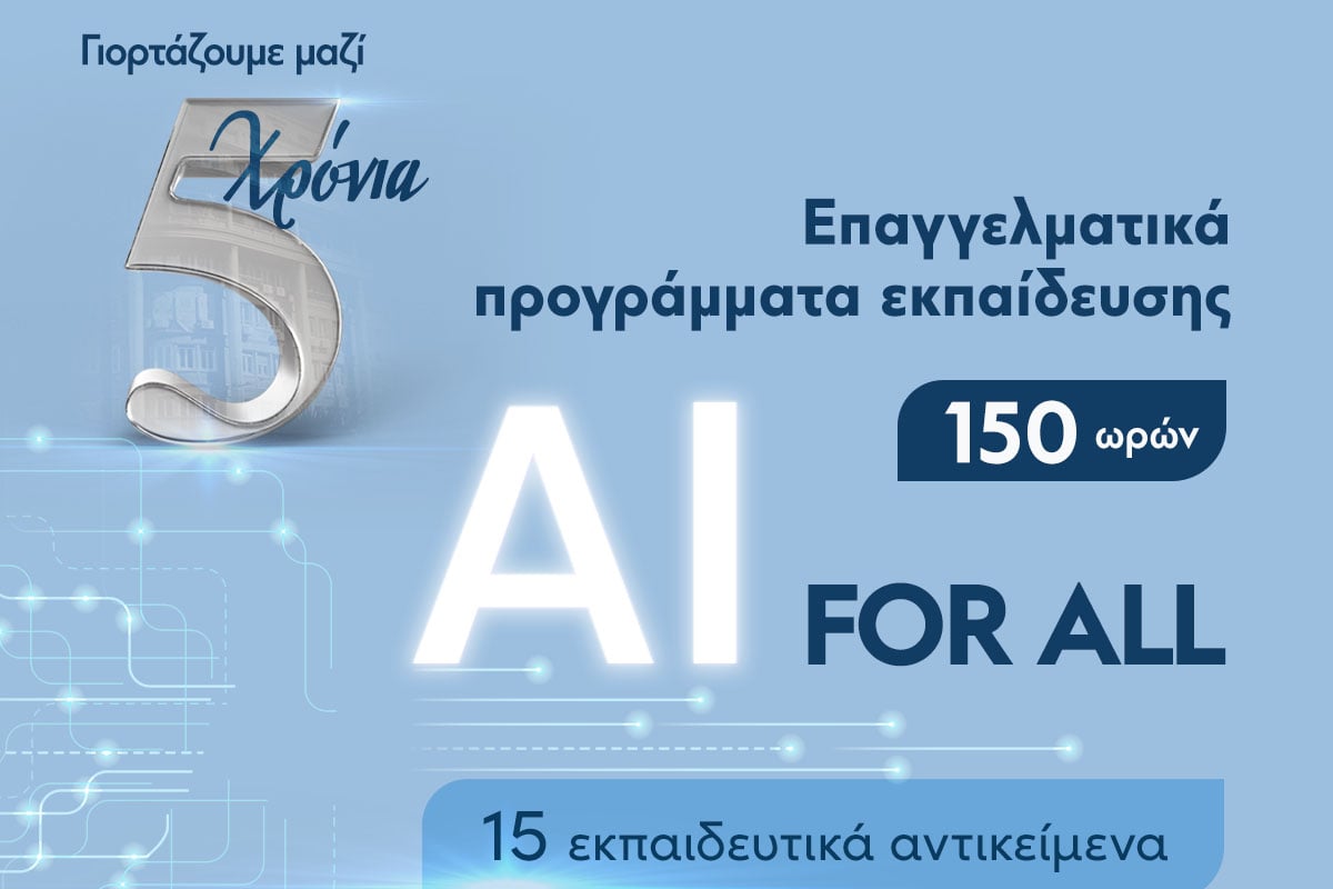 Τα προγράμματα «AI FOR ALL» καλύπτουν ένα ευρύ φάσμα θεματικών πεδίων, που συνδυάζουν την τεχνολογία με τις ανάγκες της σύγχρονης αγοράς εργασίας: