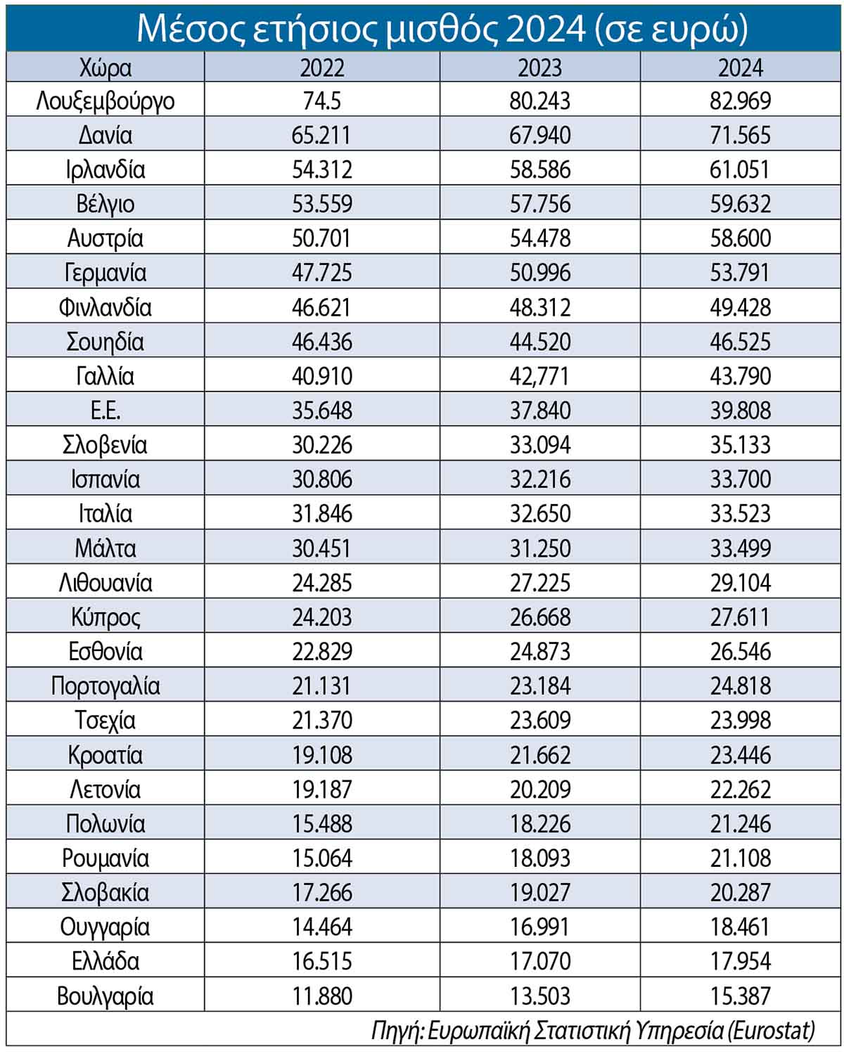 Ο μέσος μισθός στο Λουξεμβούργο είναι 4,6 φορές υψηλότερος από αυτόν της ΕλλάδαςΣτα χαμηλότερα επίπεδα αποδοχών εξακολουθεί να βρίσκεται η Ελλάδα στην κλίμακα της...
