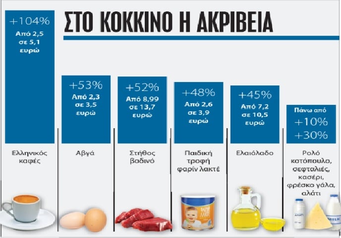Κανένας πόλεμος, καμιά πανδημία και κανένας πληθωρισμός δεν μπορεί να δώσει βάσιμη εξήγηση σ’ αυτή την «ελληνικής προέλευσης» εκτίναξη τιμών μέσα σε τρία και τέσσερα χρόνια, ακόμα και σε προϊόντα εγχώριας παραγωγής.