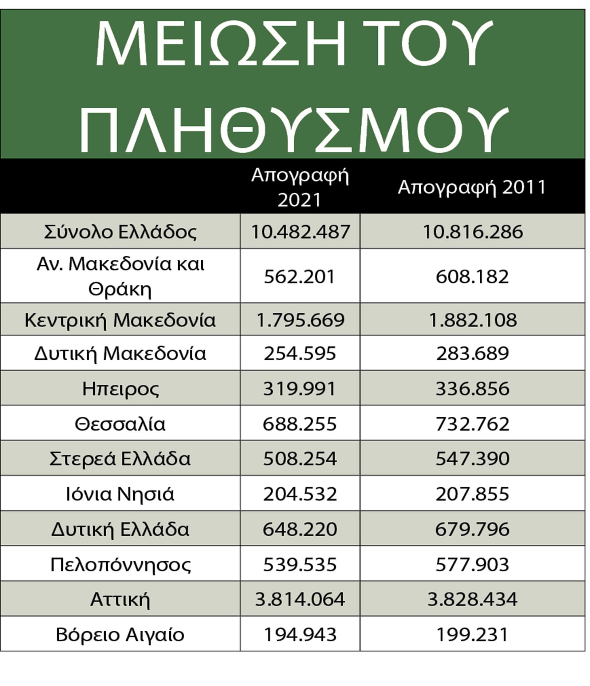 Στον αντίποδα, η περιφέρεια εμφανίζει πολύ πιο περιορισμένες αυξήσεις, ενώ σε αρκετές περιπτώσεις καταγράφεται μείωση τόσο των καταθέσεων όσο και των λογαριασμών. Αλλωστε, η τελευταία απογραφή δείχνει πως όχι μόνο ο πληθυσμός της Ελλάδας μειώνεται, αλλά και ότι η ελληνική περιφέρεια εγκαταλείπεται, με φόντο την έλλειψη επαγγελματικής προοπτικής κυρίως για τους νέους (Βλέπε πίνακα κάτω).