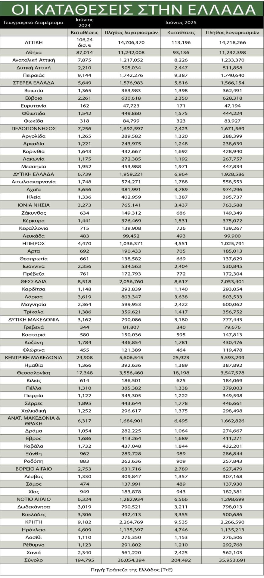 Σύμφωνα με τα στοιχεία της Τραπέζης της Ελλάδος, από το σύνολο των καταθέσεων τον Ιούνιο του 2024 που είχαν διαμορφωθεί στα 194,79 δισ. ευρώ, έναν χρόνο αργότερα εμφανίζονται αυξημένες κατά σχεδόν 9,7 δισ. ευρώ. Ωστόσο, τα 6,95 δισ. ευρώ αυτής της αύξησης ανήκουν στην περιοχή της Αττικής και άλλο 1 δισ. ευρώ στην Κεντρική Μακεδονία, λόγω της Θεσσαλονίκης.