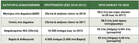 – Μητέρες ανηλίκων (Δημόσιο): Οσες συμπλήρωσαν 25ετία το 2011 με ανήλικο τέκνο, το όριο ηλικίας για το 2026 μπορεί να διαμορφωθεί γύρω στα 58,5 έτη, ανάλογα με την ημερομηνία γέννησης.