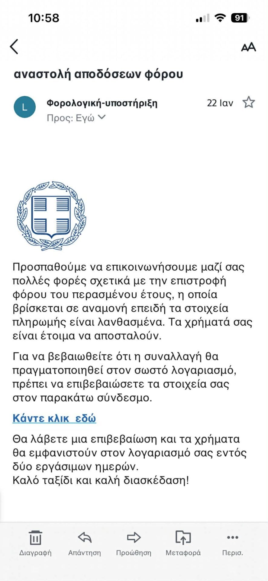 Πριν λίγο, εστάλη μαζικά σε άγνωστο αριθμό φορολογουμένων ένα e- mail το οποίο, υποτίθεται ότι έχει σταλεί από την ΑΑΔΕ, με στόχο τα θύματα να ‘’τσιμπήσουν’’ στο δόλωμα και να πληκτρολογήσουν ευαίσθητα προσωπικά δεδομένα (κωδικούς πρόσβασης, αριθμούς καρτών, κλπ.).