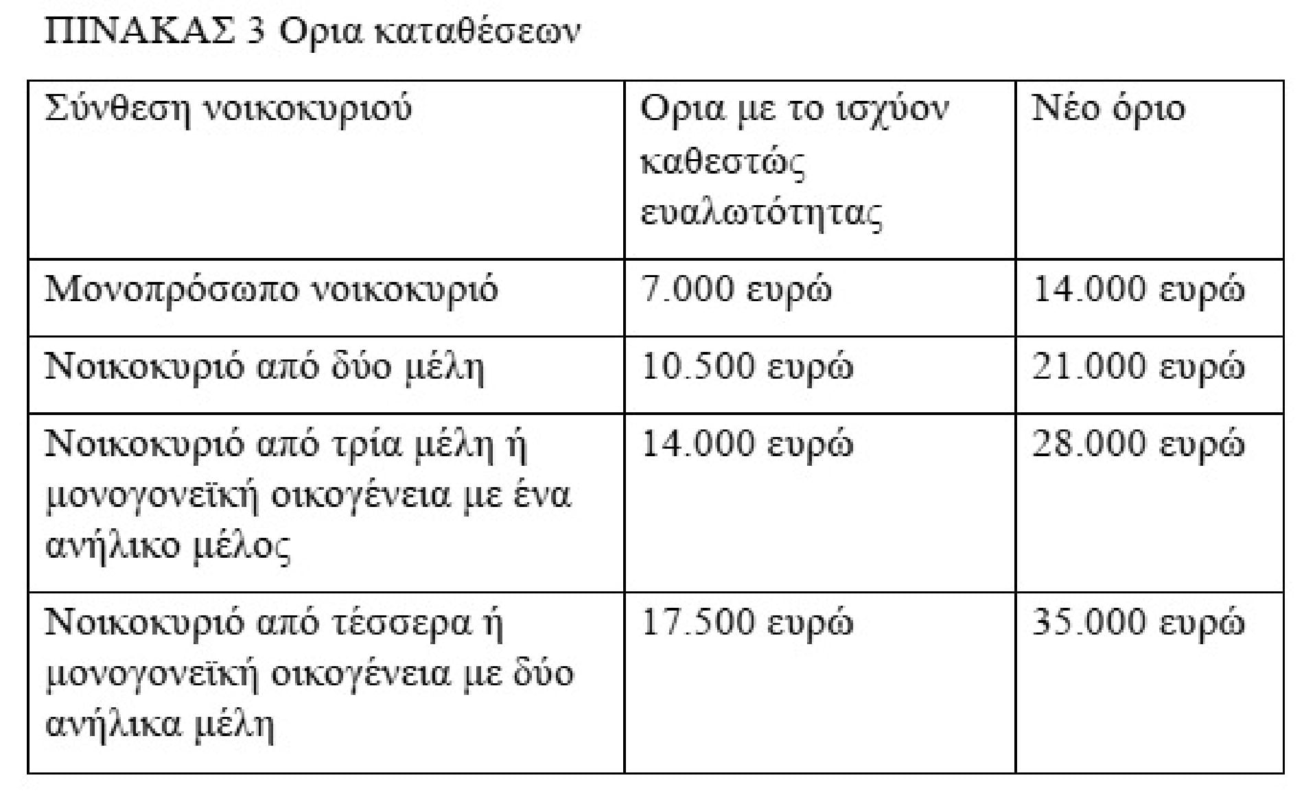 Τα νέα όρια καθορίζονται στα 14.000 ευρώ για μονοπρόσωπο νοικοκυριό, στα 21.000 ευρώ για νοικοκυριά με δύο μέλη, 28.000 ευρώ για τριμελή ή μονοπρόσωπα νοικοκυριά με ένα τέκνο, στα 35.000 ευρώ για τετραμελή νοικοκυριά και στα 42.000 ευρώ για πενταμελή. Τα ίδια όρια ισχύουν και για τις καταθέσεις που μπορεί να διαθέτουν οι οφειλέτες, ενώ τα περιουσιακά όρια καθορίζονται αντίστοιχα από 240.000-360.000 ευρώ (βλέπε πίνακες 1, 2, 3).