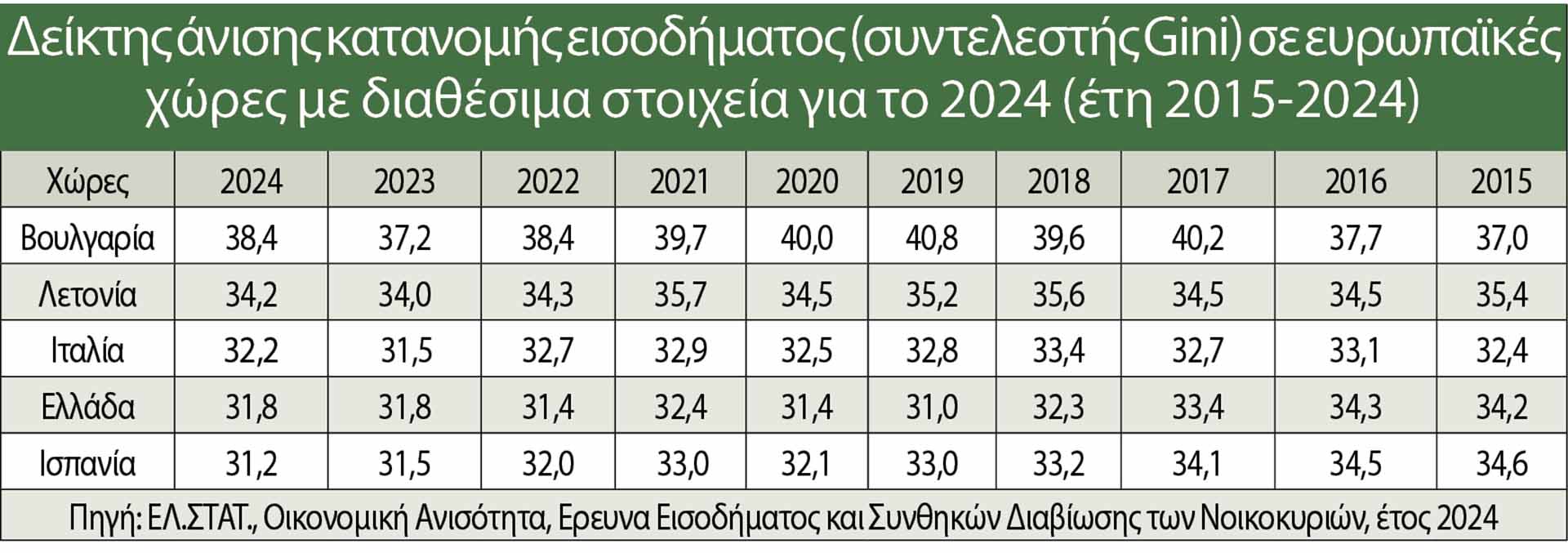 Ετσι, σύμφωνα με τον δείκτη μέτρησης της άνισης κατανομής εισοδήματος (Gini) επί Κυριάκου Μητσοτάκη, η κατάσταση όχι μόνο δεν βελτιώθηκε, αλλά αντιθέτως επιδεινώθηκε. Οπως φαίνεται και από τη διαχρονική πορεία από το 2015 έως το 2024, η χειρότερη χρονιά ήταν το 2016 και ακολούθησε μία σαφής πτωτική πορεία έως το 2019. Εκτοτε, όμως, οι ανισότητες μεγάλωσαν!