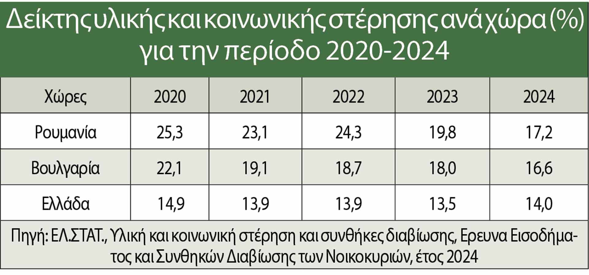 Κακές είναι οι επιδόσεις της ελληνικής οικονομίας και σε ό,τι αφορά την υλική και κοινωνική στέρηση. Συγκεκριμένα, ο δείκτης του ποσοστού του πληθυσμού με σοβαρές υλικές και κοινωνικές στερήσεις ανέρχεται σε 14% το 2024, με την Ελλάδα να κατέχει σχεδόν σταθερά την 3η θέση στον πίνακα κατάταξης των χωρών της Ε.Ε. με τον υψηλότερο δείκτη υλικής και κοινωνικής στέρησης κατά τα τελευταία πέντε έτη (2020-2024).