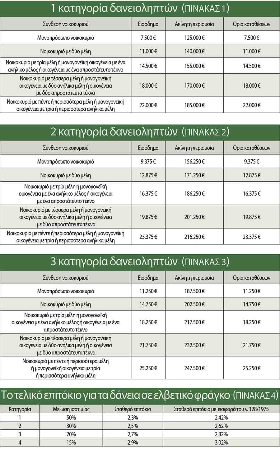 Η ρύθμιση προβλέπει τέσσερις κατηγορίες, τις οποίες οι δανειολήπτες δεν μπορούν να επιλέξουν στην πράξη. Εντάσσονται ανάλογα με το εισόδημα και την περιουσιακή τους κατάσταση και με βάση αυτά καθορίζεται το ύψος του «κουρέματος», αλλά και το επιτόκιο μέχρι τη λήξη του δανείου τους.