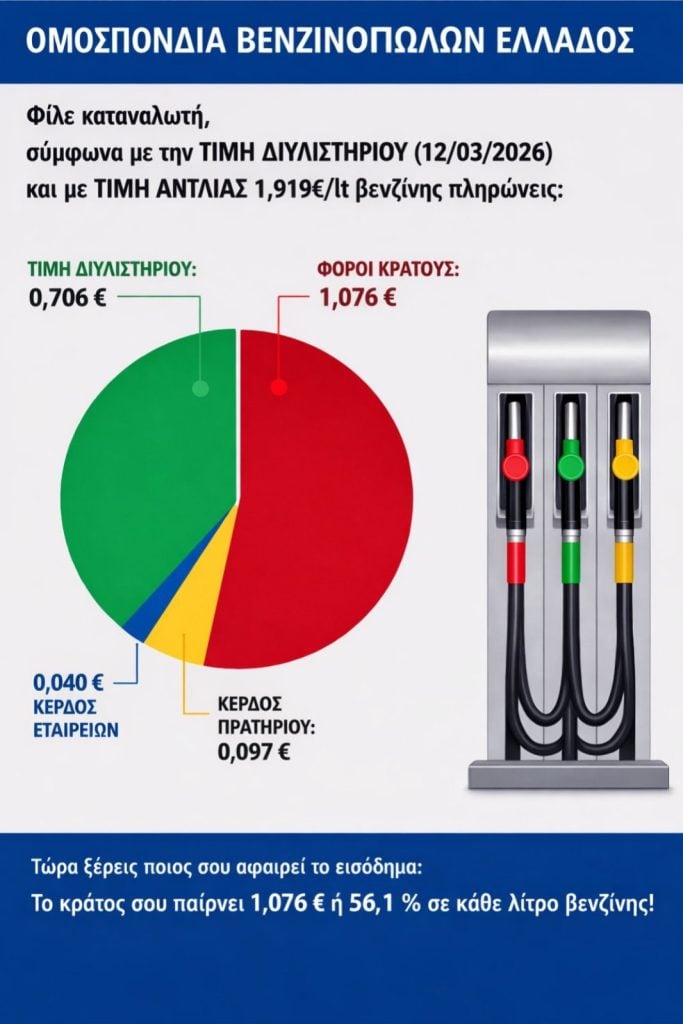 Το γράφημα της ΟΒΕ είναι αποκαλυπτικό: όταν η τιμή της αμόλυβδης ήταν 1,919 ευρώ ανά λίτρο (έχει ήδη ξεπεραστεί από τις καθημερινές ανατιμήσεις), άνω του 56% ήταν το ποσοστό της φορολογίας που εισπράττει το κράτος, δηλαδή 1,076 ευρώ ανά λίτρο. Η τιμή του διυλιστηρίου ανέρχεται σε 0,706 ευρώ το λίτρο, το κέρδος των εταιρειών 0,040 ευρώ ανά λίτρο και το κέρδος του πρατηριούχου μόλις 0,097 ευρώ το λίτρο.